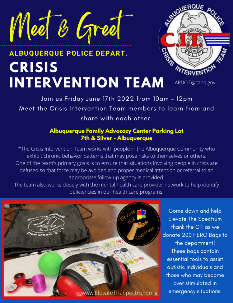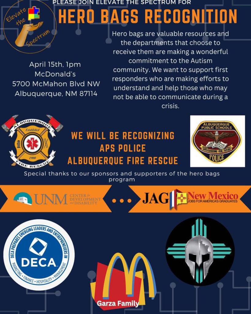 After hearing so many negative stories about interactions between first responders and individuals on the spectrum, Elevate set out to help bridge the gap in communication and awareness. Board member Tarra Main came up with the idea of “HERO Bags“. These bags contain fidget tools, custom communication boards, headphones, and white boards to assist individuals with sensory and communication needs or who may become non-verbal during emergency situations. Elevate teamed up with the UNM’s Center for Development & Disability’s Autism+ team to create a training video for 1st responders to educate them on the need for and proper use of the tools.